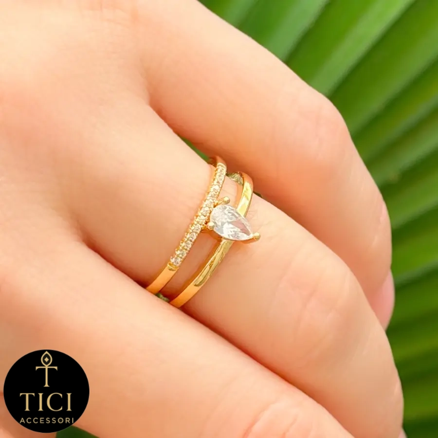 Anel de Aro Duplo com Zircônia em Gota e Filete de Brilho