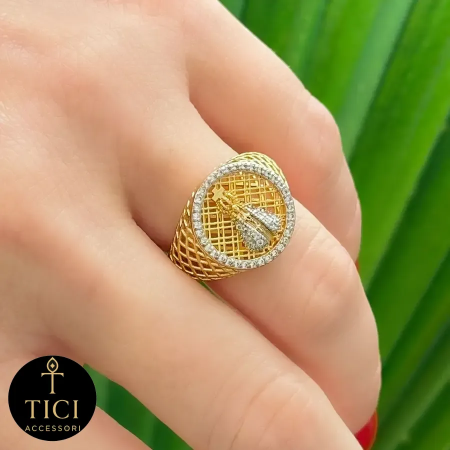 Cada navete possui um acabamento misto: as bordas são em metal liso e polido com banho dourado de alta qualidade, enquanto o centro é densamente cravejado com microzircônias brilhantes. O aro é robusto e possui uma geometria levemente facetada, conferindo um ar de joalheria moderna e minimalista. Por ser aberto, oferece um conforto excepcional e um ajuste leve, sendo ideal para compor mixes de anéis ou para ser usado como um ponto de luz diferenciado no visual.