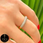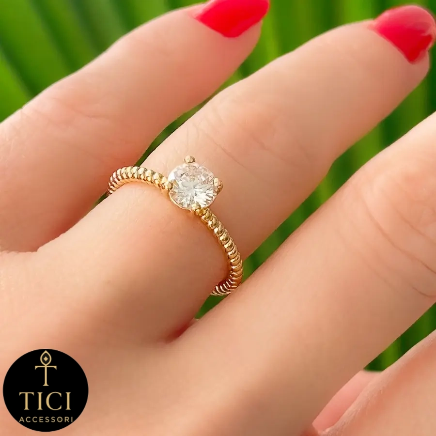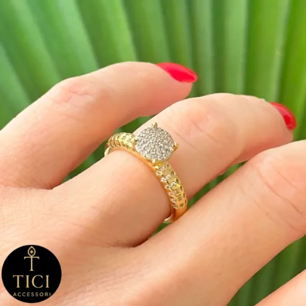 O diferencial desta peça está no seu aro largo, que apresenta um trabalho de textura no metal e filetes laterais também cravejados, elevando o design para um nível mais luxuoso. Com banho dourado de alta qualidade, é uma joia que preenche muito bem o dedo, sendo perfeita para quem busca uma peça com presença e acabamento refinado.