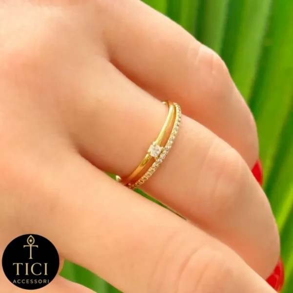 Anel de Aro Duplo com Micro Solitário e Filete de Brilho