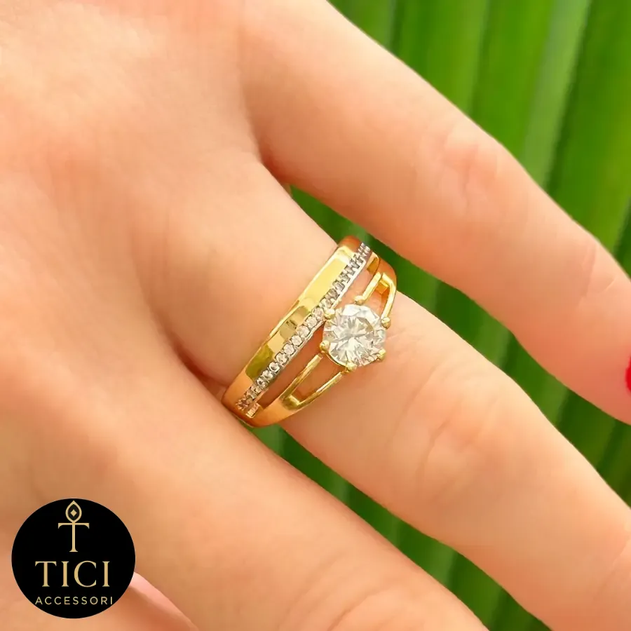 O contraste entre o brilho intenso das pedras e o reflexo do banho dourado cria um efeito visual de movimento e sofisticação. Com uma estrutura leve e confortável, é uma joia versátil que pode ser usada como um aparador diferenciado ou como um acessório solo para adicionar um toque de brilho delicado ao visual diário.