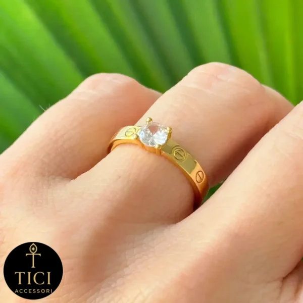 Esta peça combina o estilo tradicional do anel solitário com um toque de design moderno no metal. O destaque principal é uma zircônia central transparente e brilhante, presa por garras delicadas que permitem a entrada de luz na pedra.