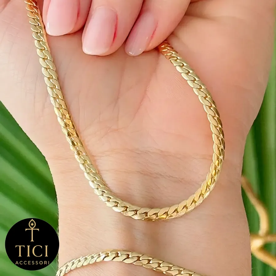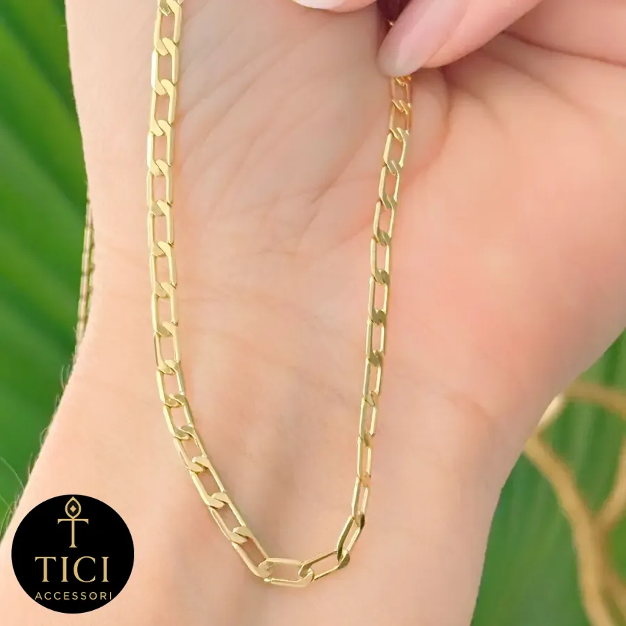 - Elos em Losango Dourados: A corrente é composta por delicados elos em formato de losango, criando uma textura visual única e sofisticada que envolve o pescoço com leveza e um brilho dourado encantador.